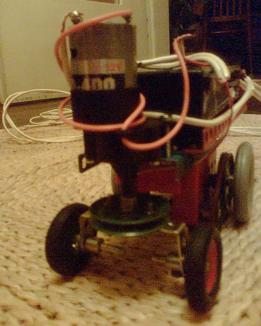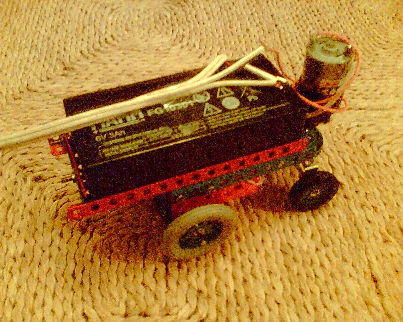 Tady je vidět, jak vypadá. Má dva motory, jeden hnací, druhý zátáčecí. Na korbě si robot veze 6V 3Ah akumulátor, který dodává celému komplexu energii. Je shopen pohybu do všech stran. Řízen je zatím velmi provizorně pomocí čtyř kabelů.